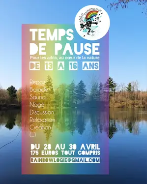 Temps de Pause pour les adolescents de 13 à 16 ans Du 28 avril 10h au 30 avril 17h 3 jours – 2 nuits au cœur de la nature avec Christine. 175 euros tout compris (logement en tente) Une retraite sur mesure pour se reposer, créer et échanger. Des espaces d’échanges/discussion, balade, relaxation (méditation, yoga, respiration,